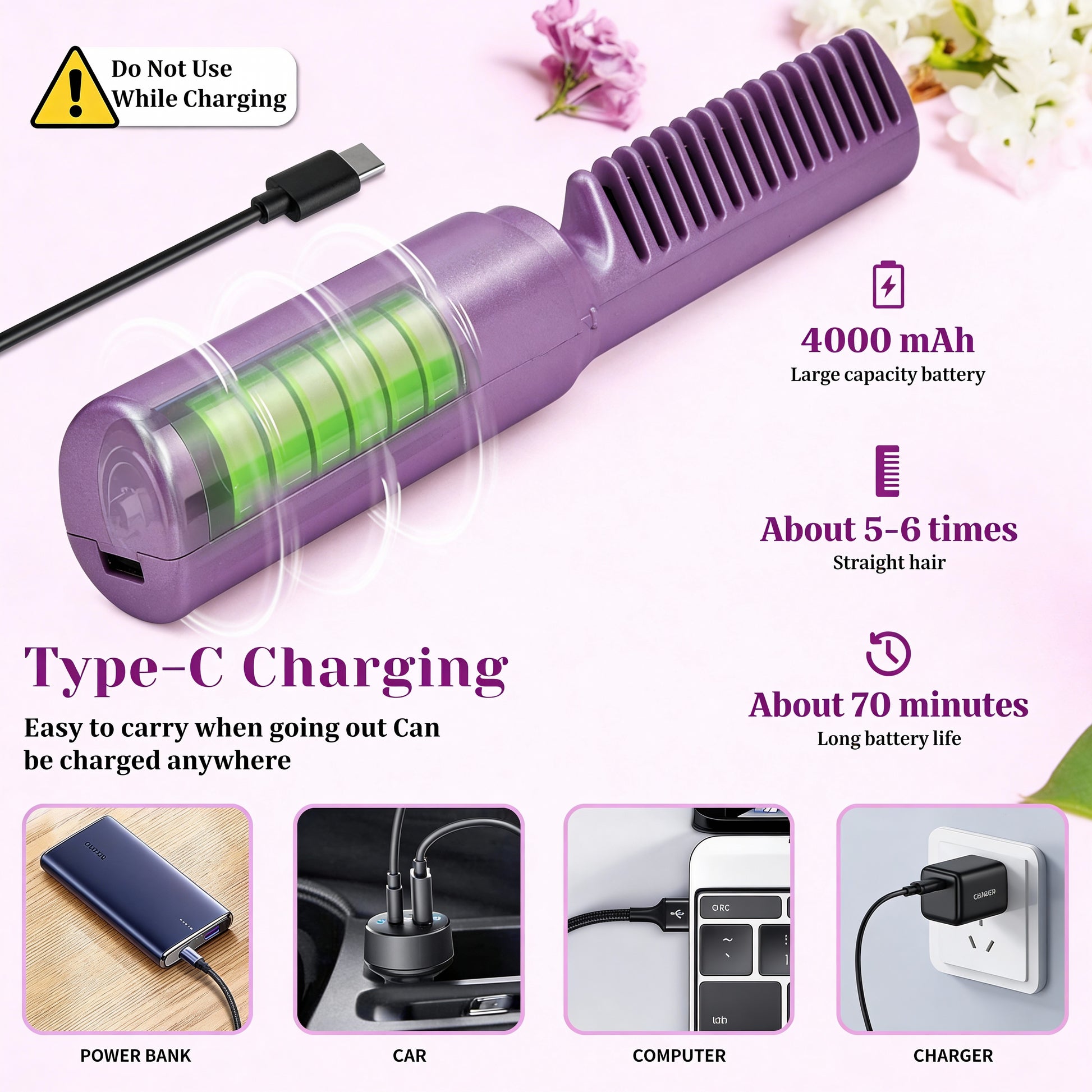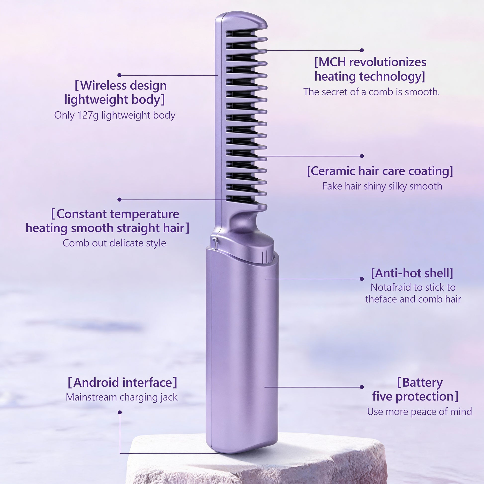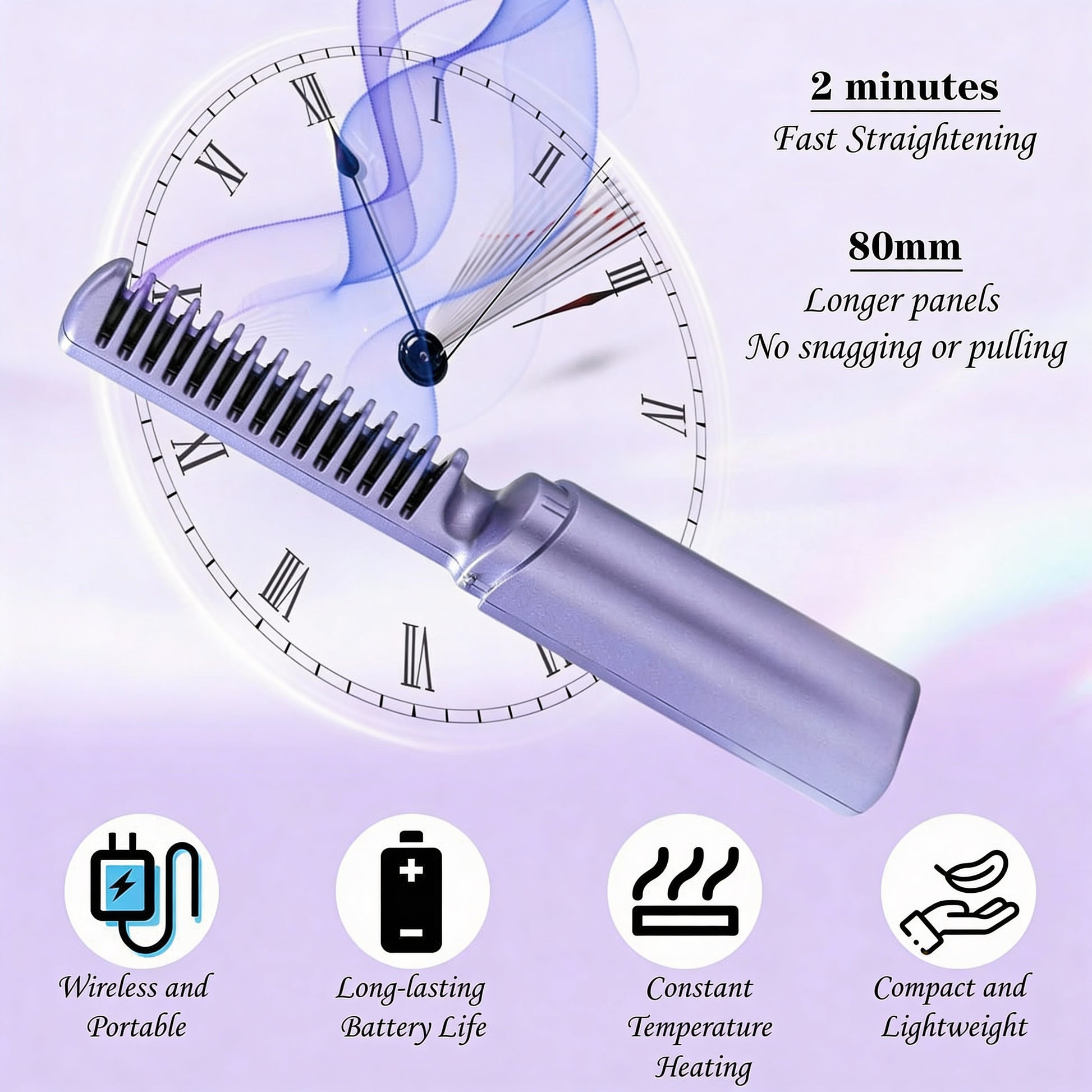 💜 2-Minute Salon-Smooth, Frizz-Free Hair – Portable Cordless Straightener Comb